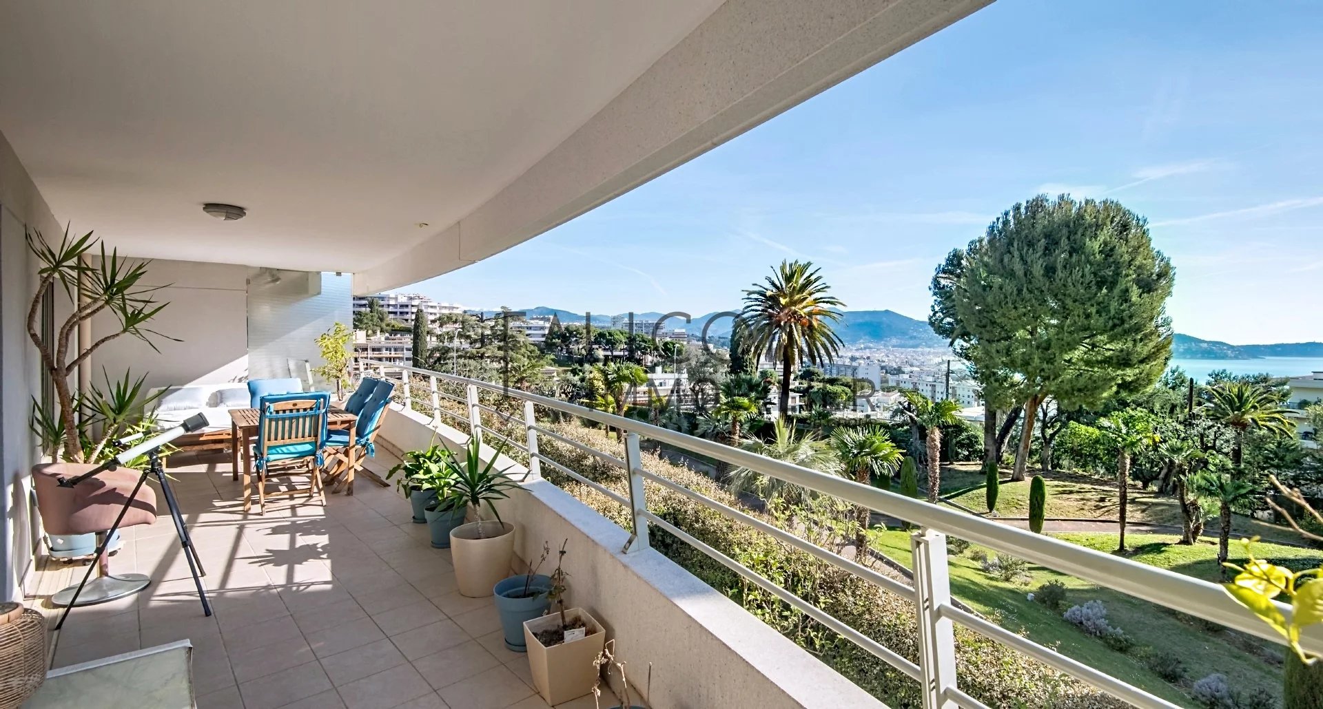 Il se compose de 3 chambres et 3 salles de bains, dispose de deux terrasses de 30 m² et 20 m², de deux places de stationnement ainsi que d’une cave, et offre une vue panoramique exceptionnelle, exposée sud-est, sur la mer et la Baie des Anges.